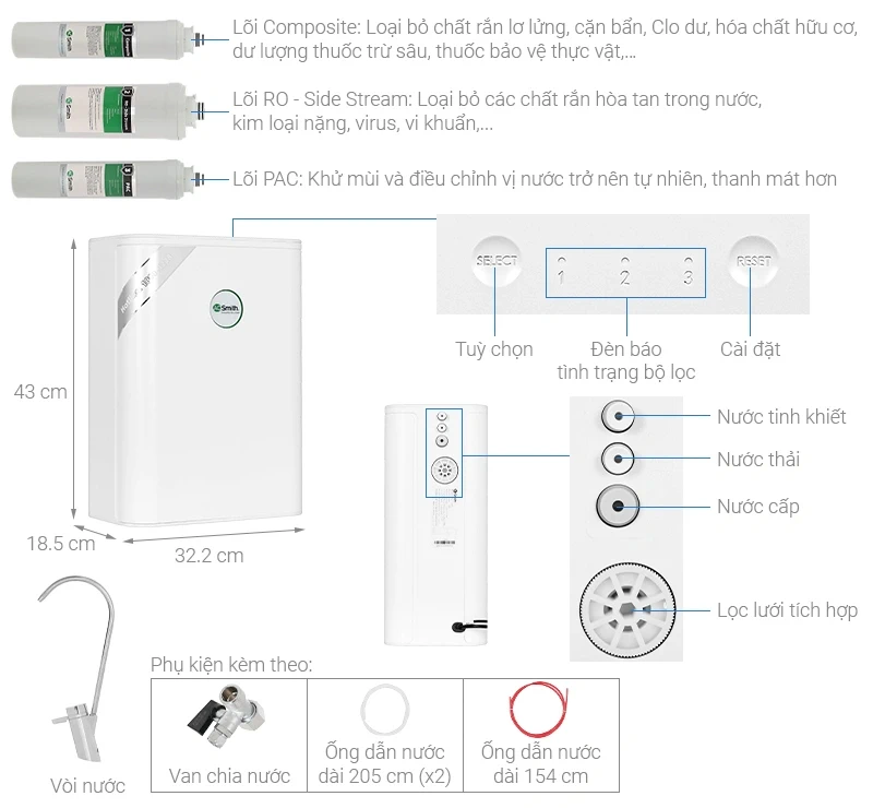 - Tiện ích hiện đại: Tự động sục rửa màng lọc, xả nước thải và báo thay lõi.