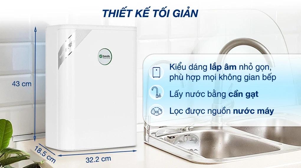 Máy lọc nước RO AOSmith S400 được thiết kế tinh tế với kiểu dáng để bàn hoặc lắp âm, sẽ phù hợp đặt dưới bồn rửa hay kệ bếp, giúp tiết kiệm không gian tối đa. Thiết kế này không chỉ mang lại sự gọn gàng mà còn tạo sự thuận tiện trong quá trình sử dụng và bảo trì. Người dùng có thể dễ dàng lấy nước nhờ cần gạt tiện lợi.